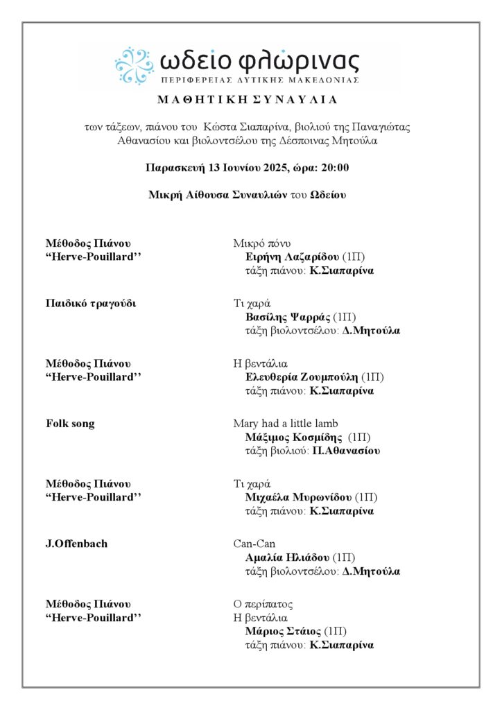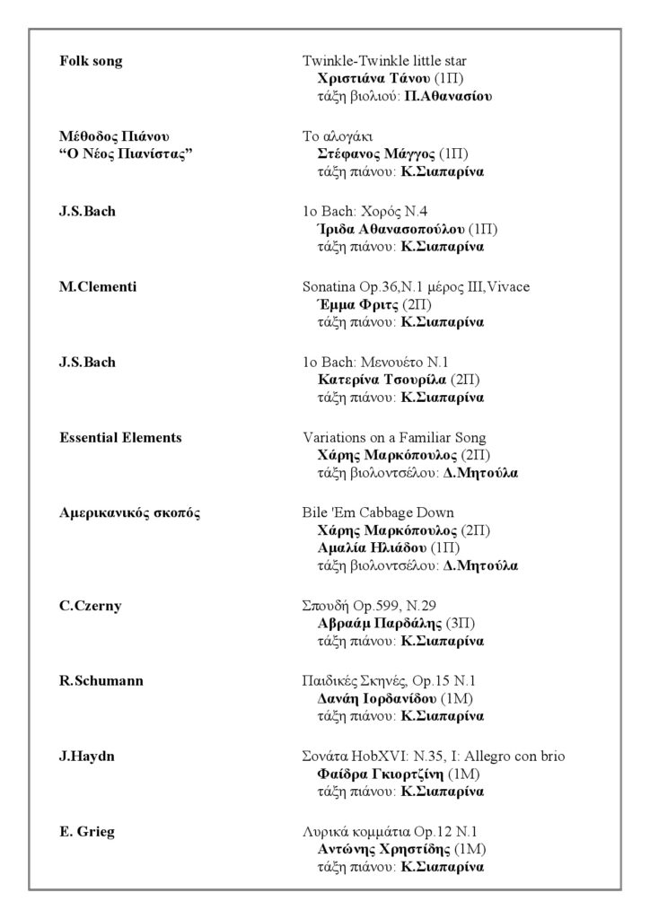 των τάξεων, πιάνου του Κώστα Σιαπαρίνα, βιολιού της Παναγιώτας Αθανασίου και βιολοντσέλου της Δέσποινας Μητούλα