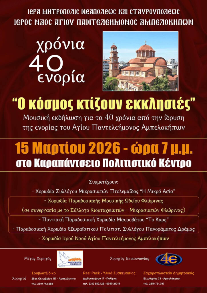 Η Χορωδία Παραδοσιακής Μουσικής του Ωδείου Φλώρινας Π.Δ.Μακεδονίας, συμμετέχει στην εκδήλωση με τίτλο “Ο κόσμος κτίζουν εκκλησιές” την Κυριακή 15 Μαρτίου 2026 7 μ.μ. στο Καραπάντσειο Πολιτιστικό Κέντρο Αμπελοκήπων Θεσσαλονίκης. Η Μουσική εκδήλωση διοργανώνεται από τον Ιερό Ναό Αγ. Παντελεήμονα Αμπελοκήπων για τα 40 χρόνια από την ίδρυση της ενορίας.