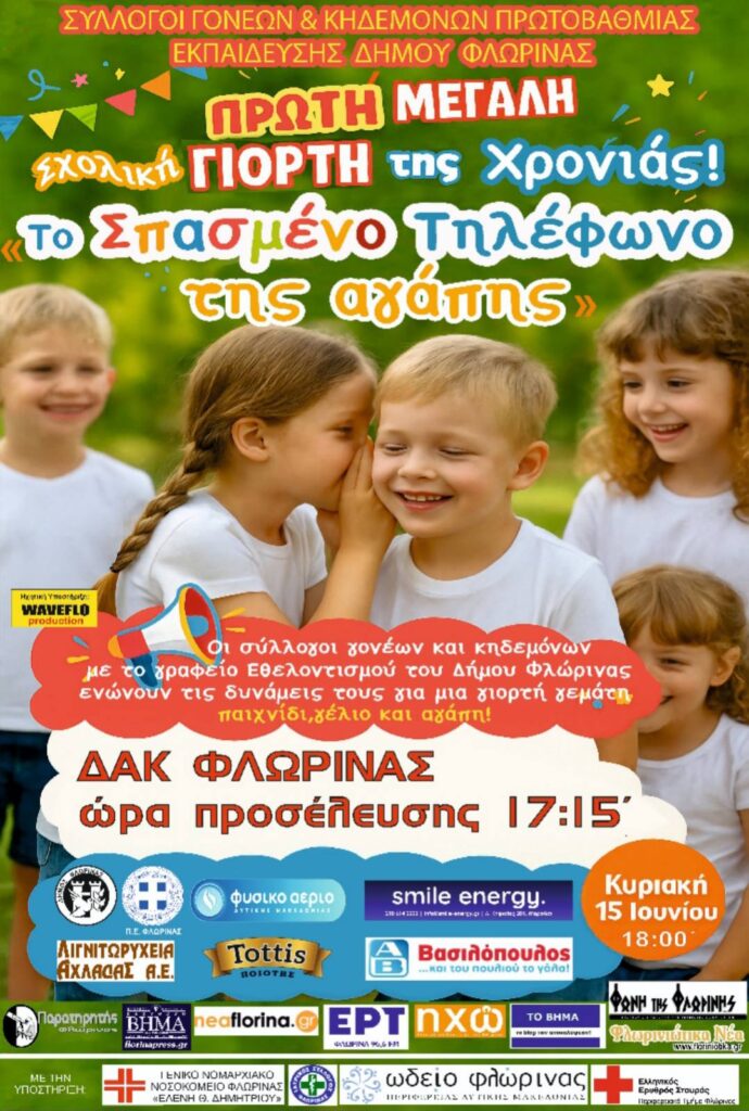 Η παιδική χορωδία του Ωδείου Φλώρινας Περιφέρειας Δυτικής Μακεδονίας συμμετέχει στην Πρώτη Μεγάλη Σχολική Γιορτή της Χρονιάς “το Σπασμένο Τηλέφωνο της αγάπης” . Την Κυριακή 15 Ιουνίου 2015 στο ΔΑΚ Φλώρινας. Ώρα προσέλευσης 17:15.